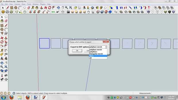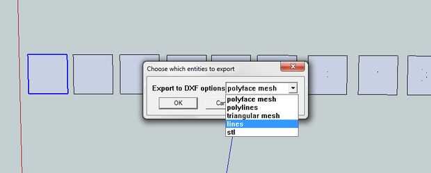 Una vez que los tengas todo, haga clic en vistas de cámara estándar / y seleccione. Esto nos permite mirar hacia abajo en ellos. Ir a la primera rodaja y seleccionar haciendo clic en él o dibujar una caja alrededor de él. Para salvar a ese segmento, haga clic en herramientas / y seleccione exportar a DXF o STL, el plugin que instalamos anteriormente. Se preguntará por una unidad de medida, tales como pulgadas, pies, etc. y luego pedirle que elija cómo desea que las líneas se interpretan como. Haga clic en «Líneas».