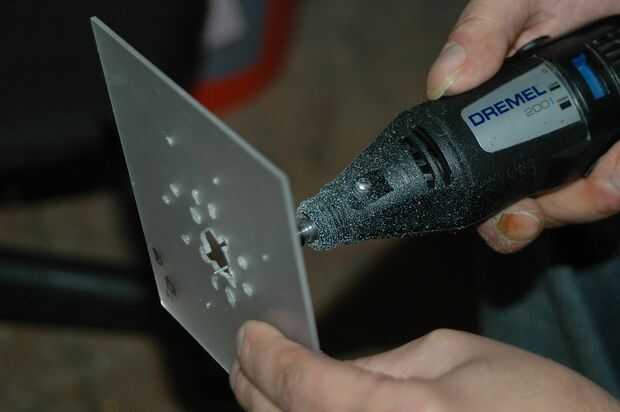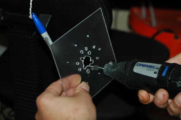 A continuación, necesitamos desbaste las áreas que cortamos para que la luz refracte y aparecen brillante. Para ello, utilice una herramienta giratoria Dremel o similar. No tenemos el derecho burr necesitaba en el espacio, pero por suerte mi carga de cheapo puerto herramienta rotativa vino con un montón de accesorios, por lo que he encontrado las rebabas pequeñas, como agujas que necesitaba. Basta con ejecutar la broca a través de las superficies interiores hasta que claramente es rascado bien, como se muestra en la segunda foto.