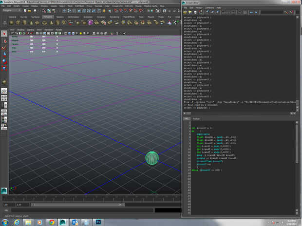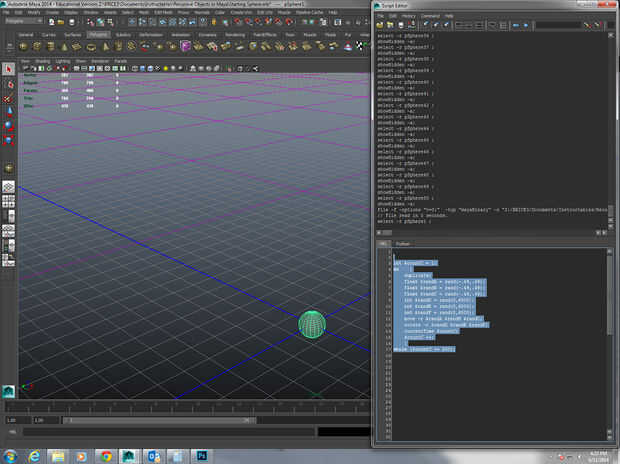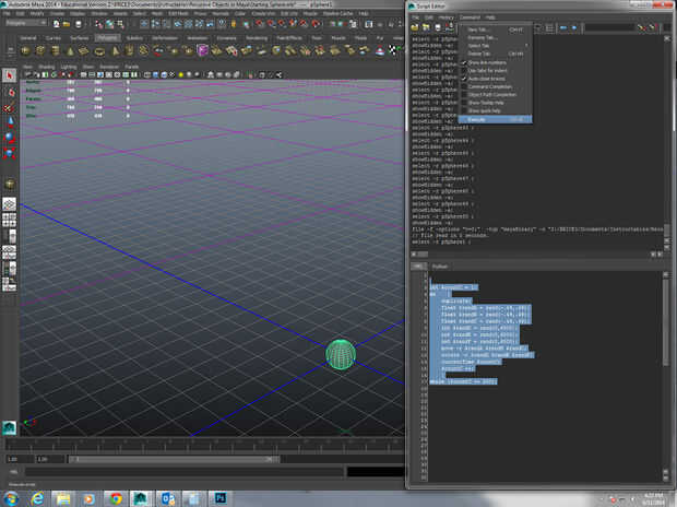 Para ejecutar la secuencia de comandos que debe seleccionar primero la esfera que existe actualmente en la escena - hacer solo clic con el botón izquierdo del ratón. Iluminará en verde cuando selecciona. A continuación, resalte todo el texto que ha copiado en el editor de scipt haciendo clic y arrastrando sobre él todos usando el botón izquierdo del ratón. Encenderá azul cuando se selecciona. Después de tener la esfera y la secuencia de comandos seleccionado, ir a "Comando" y seleccione "Ejecutar" en la barra de menús del Editor de scripts. Ejecute el script y crear todas las duplicaciones de la esfera en la escena de Maya.