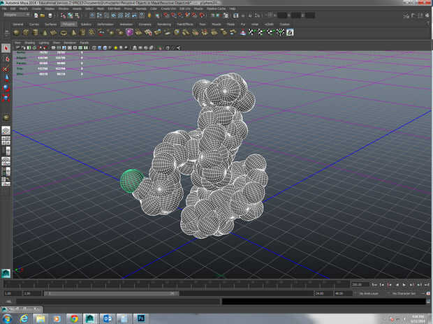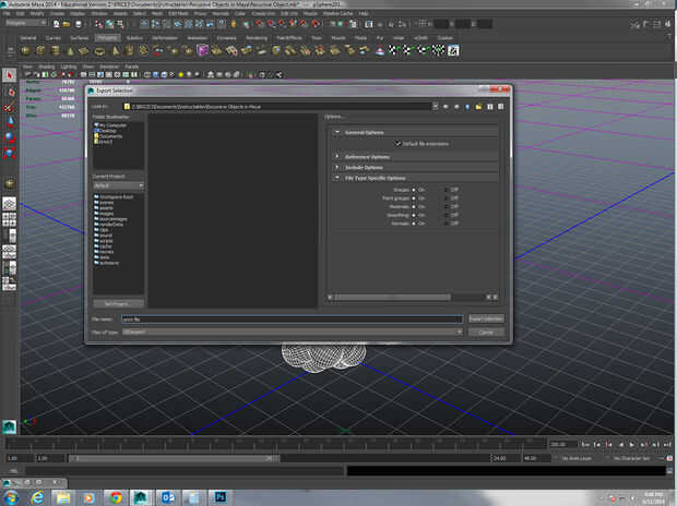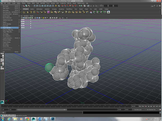Para exportar el objeto para la impresión 3D, seleccione todas las esferas haciendo clic y arrastrando con el botón izquierdo del ratón sobre todos los objetos en la escena. Una vez seleccionado, vaya a "Archivo" en la barra de menú y seleccione "exportar". En la ventana aparece el menú de "Archivos de tipo" desplegable y seleccione "OBJexport". Luego nombrar el archivo como convenga y haga clic en "Exportar selección" para terminar el proceso de exportación.