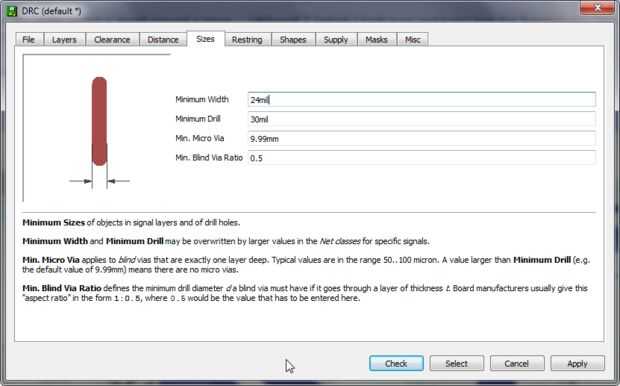 Tamaños - establece las tallas mínimas. Ancho mínimo es otro número que tire de su fabulosa casa, Parque de SST tiene 6mil, si usted lo está grabado a sí mismo, debe ser alrededor de 24 mil. Taladro mínimo para Parque de SST es 13mil, si usted lo está grabado a sí mismo, escoger lo que es el tamaño de la broca más pequeña que tienes. Micro y Blind vias están mucho más allá del alcance de este instructable