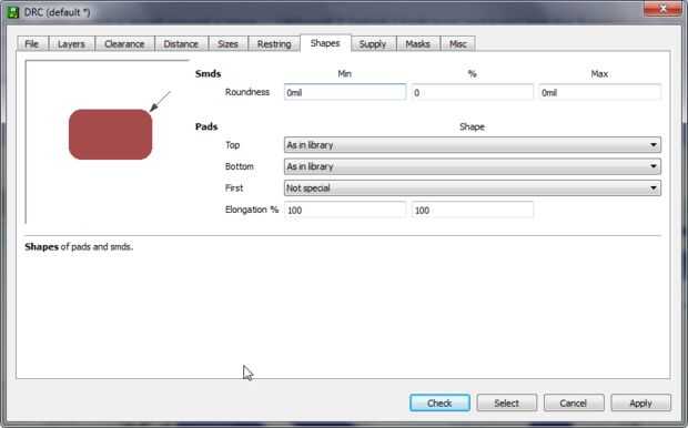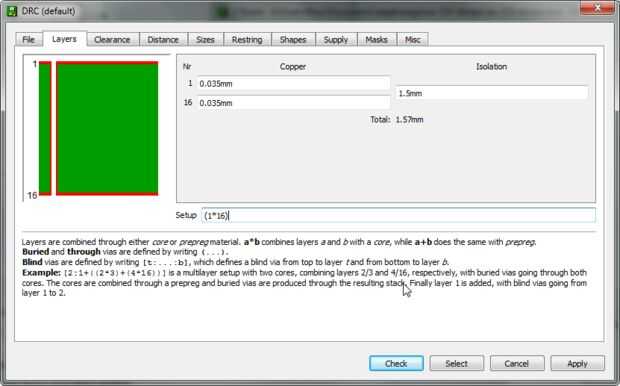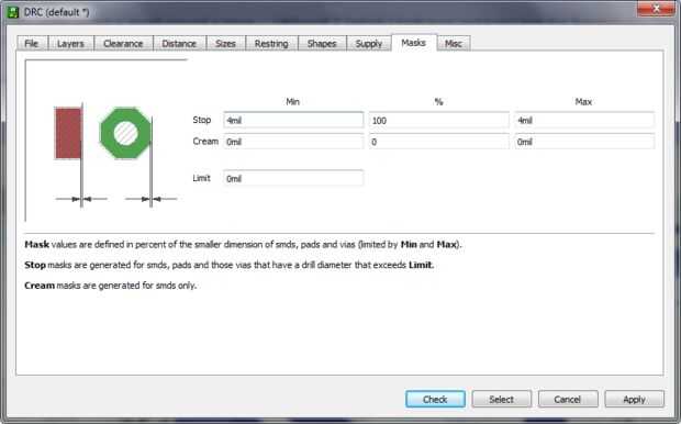 Máscaras - cuando los PCBs están fabricados, tienen una capa que cubre y aísla todo el tablero, a excepción de áreas designadas por la máscara de la parada. Después de la fabricación, si son ensamblados por una máquina o una persona con un horno de reflujo, una galería de símbolos se crea y goma de la soldadura se aplica a través de esa plantilla a los cojines/vias que deban soldarse. Parada controla el tamaño de las aberturas de la máscara de parada para las distintas partes y crema controla el tamaño de las aberturas de la plantilla. Una vez más, los valores por defecto funcionan bien para nuestro uso habitual.