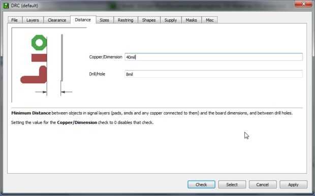 Distancia - cobre/dimensión es la distancia de cualquier ruta en el borde del tablero. Agujero de taladro es la distancia desde cualquier enrutamiento a un agujero en el tablero.