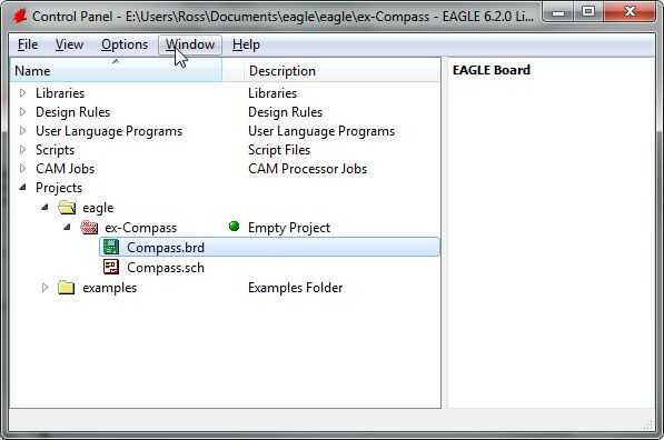 Descargar los archivos 'Compass.sch' y 'Compass.pcb' desde abajo y guardarlos en el compás Documents\eagle\ex