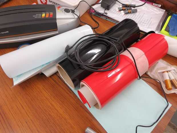 A través de algún juicio y un montón de errores, finalmente llegamos a un camino factible para hacer unas pegatinas de vinilo-esque. Usando una combinación de etiquetas de envío y laminado de vinilo transparente alcanzamos lo que creemos que es el mé