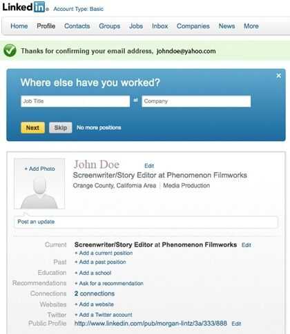 2. se le pedirá a este correo electrónico y contraseña para finalizar su información. Entonces verá una bandera verde en la parte superior de la página de LinkedIn reconociendo la confirmación.