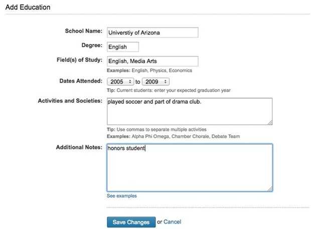 5. Haga clic en "Añadir una escuela" en el cuadro de perfil principal para agregar información de educación como escuela, grado, campo de estudio y actividades.