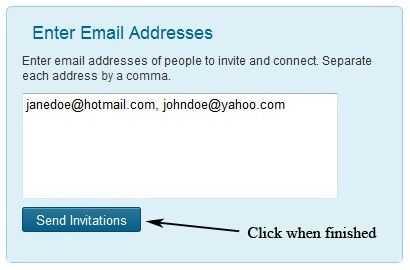 2. agregar direcciones de correo electrónico de las conexiones futuras en la casilla "Dirección de correo electrónico entrar." Asegúrese de separar cada dirección con una coma cuando invitando a más de un contacto.