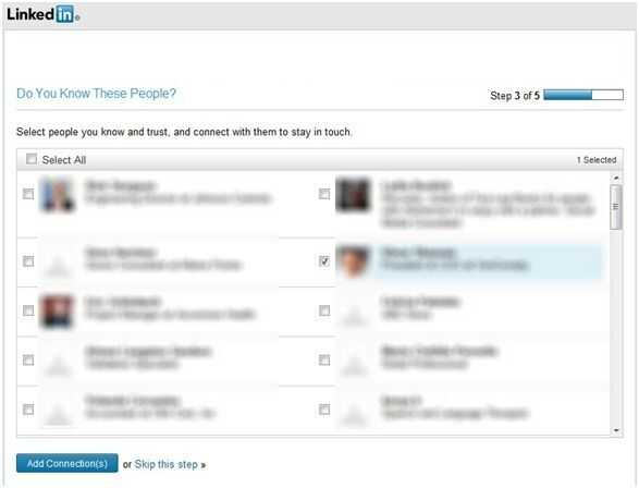 Aparecerá una tabla de perfiles de LinkedIn que se asocian a tus contactos de correo electrónico, afiliación de la empresa e información adicional. Puede agregar conexiones marcando la casilla a continuación su información de contacto.