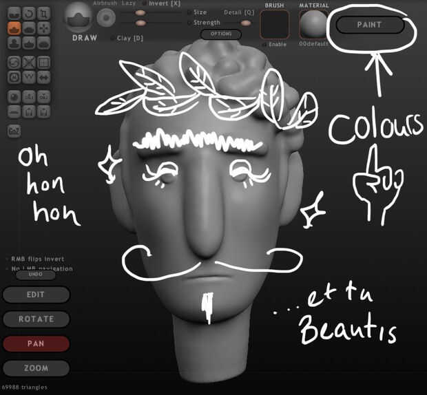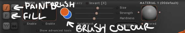Usted puede elegir la resolución de su escultura de una vez te metes en pintura. Al igual que en cualquier programa digital, cuanto mayor sea la resolución más píxeles se puede tener, ergo más detalle. Una vez realizada la escultura, te trajiste a un nuevo conjunto de herramientas y reguladores, y su escultura se cuadros, tanto como el fondo de un PSD en Photoshop. Esta siguiente parte es bastante simple. Las únicas herramientas que usted realmente tiene que preocuparse ahora son pincel y rellenar. Con los cursores a la derecha de estos, usted puede ajustar el tamaño de su pincel, fuerza u opacidad y dureza/nitidez. Al hacer clic en los círculos de color, una rueda de color se están para que usted elija el color deseado. Cuando se selecciona la herramienta relleno, simplemente puede hacer clic en su escultura y la cosa entera se convertirá en el color que ha elegido. Una vez más, ese Cheat Sheet se le dará mucha información, así que mantened abiertos!