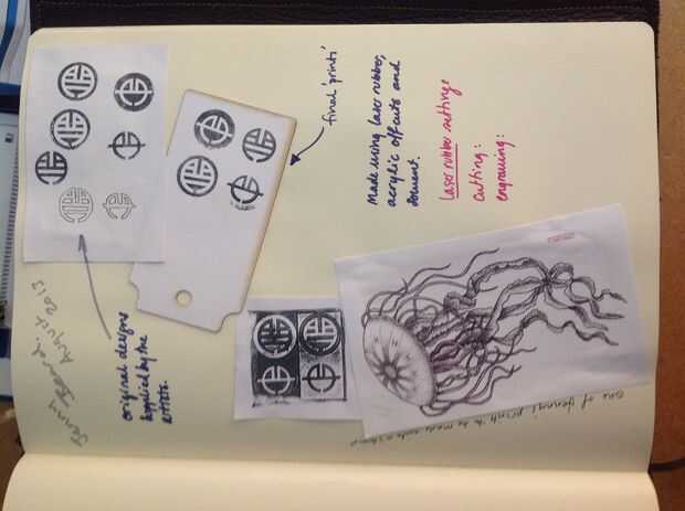 Tiendo a llevar un registro en un cuaderno Moleskine de cualquier trabajo para un cliente. Se trata de la primera página de desarrollo para Jenny Beard. Puedes ver sus bocetos originales y las primeras impresiones de los sellos.