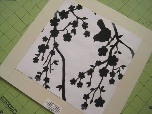 Centro de la cara de plantilla para arriba en la parte posterior de su papel de primer plano. Utilice una regla para asegurarse de que esté centrado porque una vez la imagen completa en un marco, un diseño torcido se hace más evidente. Usé la regla y un lápiz para marcar las fronteras en el papel de primer plano para mi plantilla.