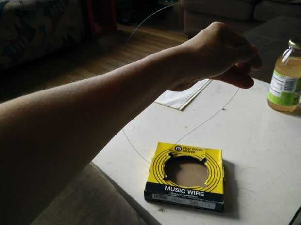 2), utilizando cortadores diagonales, cortan las 3 bandas de cobre que están alrededor del alambre de acero de la apertura frontal que acaba de hacer.