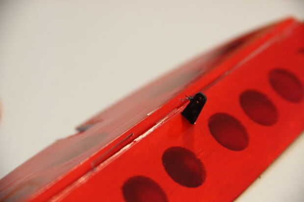 En este paso usted debe añadir los cuernos del timón en las partes móviles de los timones en las pequeñas ranuras que están diseñadas para soportar estos, luego se pegan en su lugar.