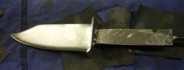 La empuñadura debe ser soldado con autógena en el lugar, si tienen un ajuste perfecto, entonces solo soldar desde 'abajo'. Pero si, como yo, la ranura es un poco más grande que el tang, soldar todo y luego la rutina por exceso del metal.