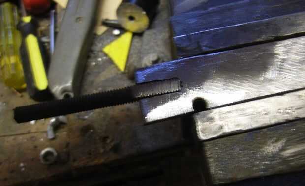 En este punto tuve la idea de usar una varilla roscada y una tuerca para fijar la manija, cortar una ranura desde el extremo de la espiga, y soldado con autógena una longitud de varilla roscada (a.k.a, perno con cabeza cortado) en el lugar.