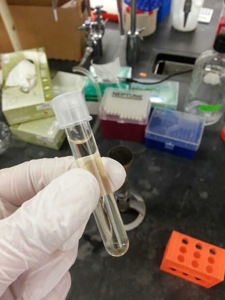 Ahora queremos alícuota nuestro caldo LB con kanamicina-añadió a un tubo de poliestireno fondo redondo pequeño BD Falcon 5 mL. Esto tiene una tapa especial que no apriete, lo que para que algunos gases a escapar, razón por la cual utilizamos esto para crecer nuestras bacterias puesto que producen gas mientras crecen y viven. Sin embargo, esto significa que nosotros debemos tener cuidadosos de no volcarla o mezclar por inversión.