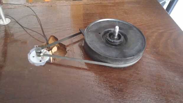 Este voltaje será lo suficientemente alto para nuestra necesidad de velocidad (voltaje = rpm) y esta corriente deberá ser lo suficientemente alta para la torsión necesaria (actual = par). Si no se ajusta al par, todavía tenemos un cociente del engranaje entre el motor y el plato giratorio debido a la correa. La velocidad del motor depende también de este cociente del engranaje. La velocidad del motor viene otra vez junto con el ruido y la vibración de la placa base. Ves, esto es una cosa que necesita pruebas y prueba y error.
