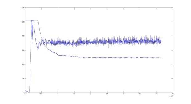 El primer controlador PID, que utiliza los valores calculados, mostró un comportamiento bueno pero no impresionante durante mis pruebas. Experimenté un poco y endet hasta con Ki = Kp = 2 y un pequeño Kd = 0.2 (primer cuadro). Esto conduce a un cambio más bajo de mi tensión del motor a cambios pequeños pero una gran reacción del controlador a grandes cambios (segunda foto). Estos cambios bruscos, que son responsables de controlar más rápido, tienen también una negativ: el motor entra en "plenos poderes" y el plato giratorio tiene un sobrepaso principal. Esto no es importante, si el giradiscos se utiliza correctamente, ya que sólo se debe ejecutar con la misma velocidad o encendido y de botones. Pero si la tengo con mi dedo, acelera. Esto puede evitarse al limitar la velocidad de máximo control motor a aproximadamente 80% por medio del software.
