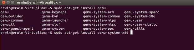 Ya que estamos creando un emulador de Android en un ordenador en vez de instalar uno en un smartphone, primero tendremos que instalar Qemu en nuestro equipo; QEMU nos permite correr una imagen de sistema operativo Android en nuestro ordenador. Instalación de Qemu es fácil; simplemente escriba en el "sudo apt-get install" como se muestra en la foto de arriba en el terminal del sistema, el sistema sería entonces automáticamente descargar e instalar el proyecto Qemu para usted. Si no es conectarse a su máquina como el usuario root, el terminal le pedirá el entrar su contraseña de la computadora antes de la instalación.