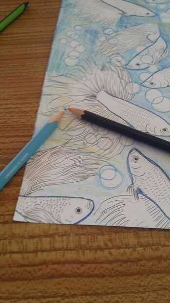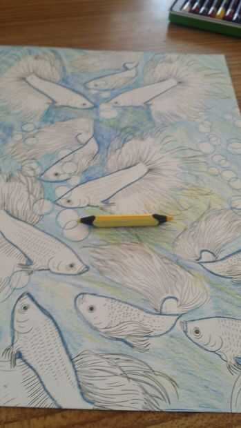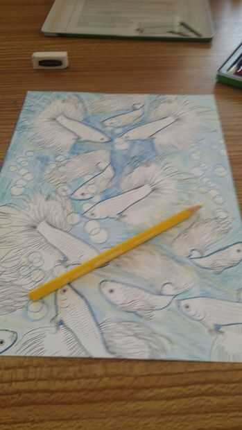 aquí es una guía paso a paso para conseguir peces coloridos!Paso 1: equipo de Equipment:Lápiz de coloresSacapuntasTrazadores de líneas finasMarcadores de gran arte terapiaCepillo cepillo doble puntasFondo de agua con pecesHoja de Consejo técnico.Paso