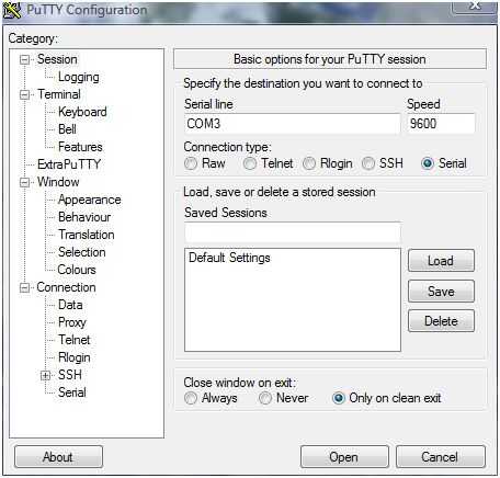 3) una vez instalado abrir el icono del escritorio y el menú de configuración de PuTTY se abrirán. Este software viene con un montón de opciones, pero por ahora sólo enfoque en crear una conexión de terminal. Bajo tipo de conexión: las opciones incluyen primas, Telenet, Rlogin, SSH y Serial. Choosethe serie botón, automáticamente se propagará la velocidad predeterminada de 9600. Seleccione la conexión adecuada de COM y pulse abrir para iniciar la sesión de terminal.