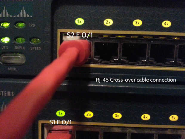2) identificar el cable cruzado (Cómo identificar un Cable Cross-over). Si el cable es nuevo, saque del embalaje y marca con un trozo de cinta para aliviar la confusión futura. Conecte un extremo del conector RJ-45 en los puertos para el S1 y S2. La luz ámbar indicará conexión y verde mostrará una conexión exitosa.