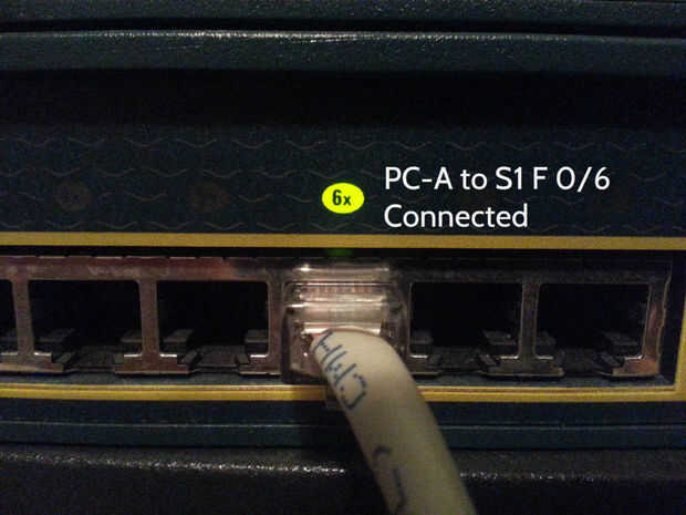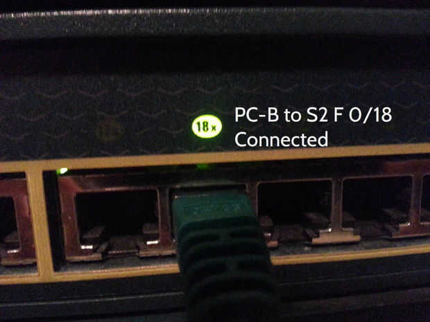 1) usando el diagrama creado en el paso 2, conecte un extremo del cable Ethernet RJ-45 a la tarjeta NIC de PC-A. Ahora Conecte el otro extremo del cable en Puerto 18 del interruptor 1 (S1). El LED se enciende color ámbar hasta que se establezca la conexión, que luego se vuelve verde.