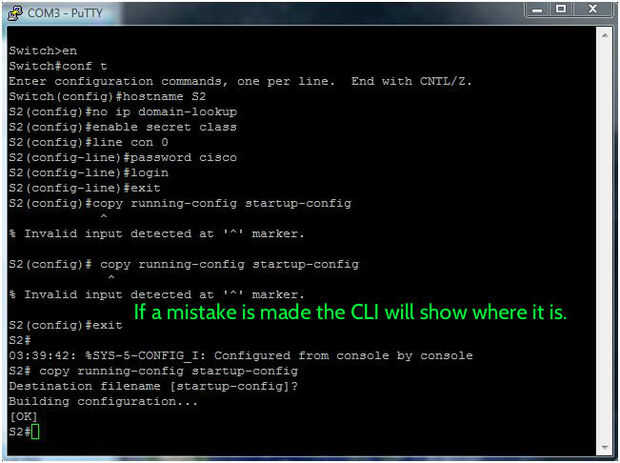 El paso por líneas de comandos son los mismos como interruptor 1 (S1). Si un error se hace la voluntad CLI muestran Dónde está. En el ejemplo tratando de ejecutar el comando "copy running-config startup-config" mientras que en configuración modo errores hacia fuera y una flecha debajo de "copia" que indica el problema se encuentra antes o en la parte del comando. La solución es salir el prompt de configuración terminal S2(config) a S2 # donde ahora se ejecutará el comando.
