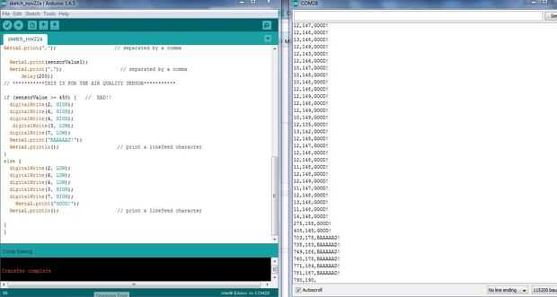 Serial.Print(sensorValue1); Serial.Print(","); separados por una coma delay(200); *** ESTO ES PARA EL SENSOR DE CALIDAD DE AIRE ***