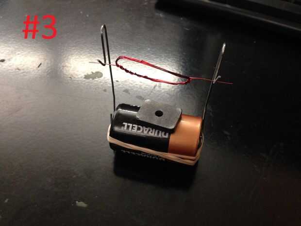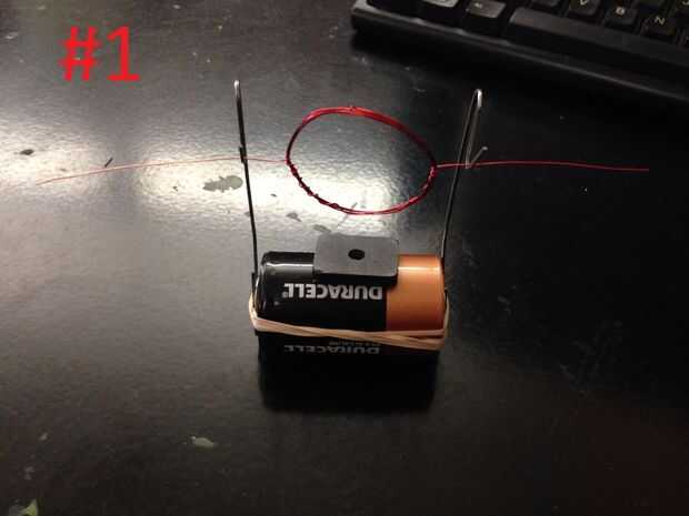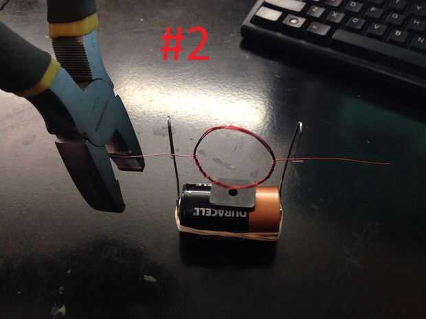 1. Coloque la bobina en las huertas creadas de los clips, como se muestra en el cuadro #1, asegúrese de que el extremo suelto donde la mitad de los restos de esmalte está en el extremo positivo (+) de la batería, este es el final con el topetón levantado.