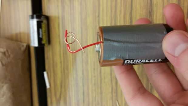 Tuvimos 2 muertos pilas D para apoyar nuestros cables que tendrá nuestra bobina sobre el imán. Nos desnudaron ambos extremos del cable por lo que podría formar un circuito completo y coloca alrededor por lo que la bobina no se balancee hacia fuera cuando se hila en una RPM decente. Tto no este corte sobre una pieza de 8cm - 10cm de alambre y tira de ambos extremos. Si utiliza una batería de D para alimentar su motor cinta el alambre al final y debería ser suficiente.