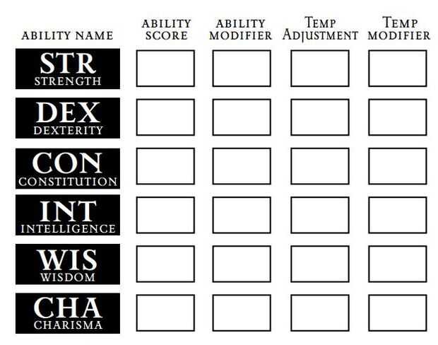 Cada personaje tiene seis puntuaciones de habilidad que determinan la aptitud física y mental. Una puntuación de capacidad de 10 representa la habilidad de una persona promedio. Fuerza (Str) representa la fuerza física de tu personaje. Destreza (Dex) representa cómo ágil y acrobático es su carácter. Constitución (Con) representa su carácter cómo resistente es a la lesión. Inteligencia (Int) representa la habilidad de tu personaje para pensar lógicamente y recordar información. Sabiduría (Sab) representa la experiencia y la intuición de tu personaje. Carisma (Cha) representa la confianza de tu personaje y las habilidades sociales (y también sus miradas según algunos GMs).