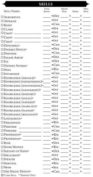 Nota: Cuando pones una fila en arte, realizar o profesión, debe elegir una especialización, que escriba sobre la línea al lado del nombre de la habilidades en la tabla de "Habilidades". Para una lista de las especialidades de arte, consulte la página de "arte". Para una lista de realizar especializaciones, consulte la página "realizar". Para una lista de las especialidades de la profesión, consulte la página de «profesión». Usted puede tomar una especialización no aparece consultando con su GM.