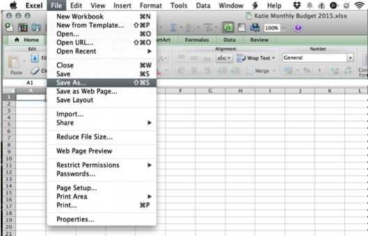 • Haga clic en archivo > Guardar como en la parte superior de la pantalla y guardar la hoja de cálculo como "Presupuesto mensual 2015 de [Inserte su nombre]."