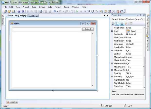 De la caja de herramientas, arrastre un cuadro de texto, web browser y un botón al formulario. Colocarlos como si estuvieran en la foto. A continuación, editar la propiedad