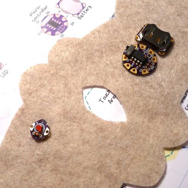 - Con una pequeña cantidad de pegamento caliente, coloque los LED y el microcontrolador en los puntos adecuados, asegurando su orientación coincide con su plan.