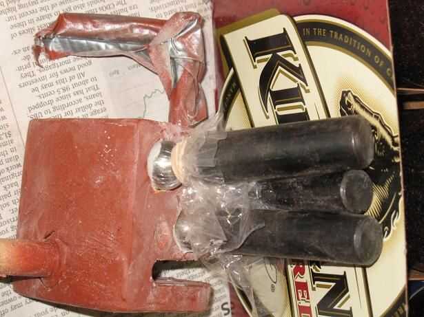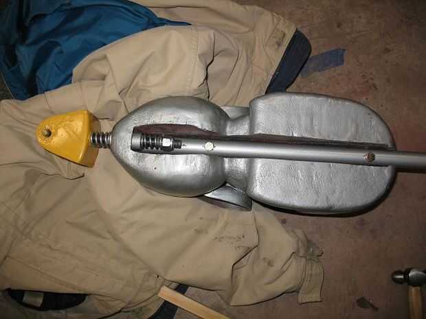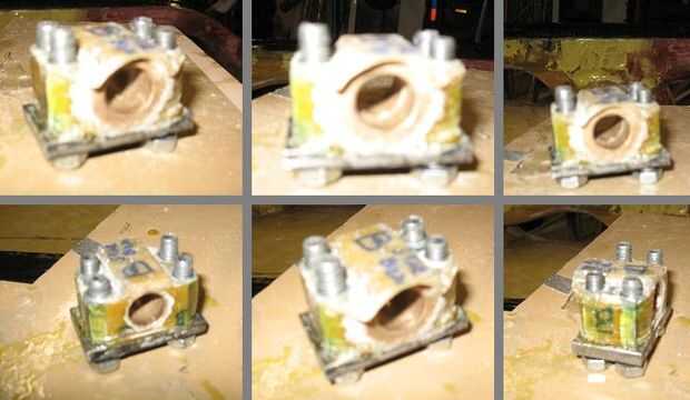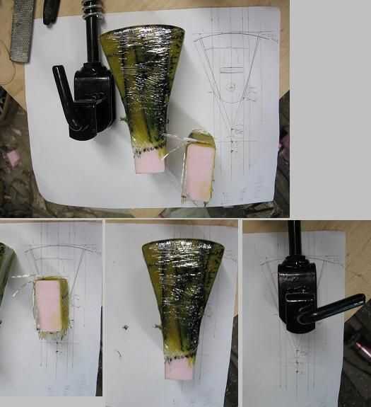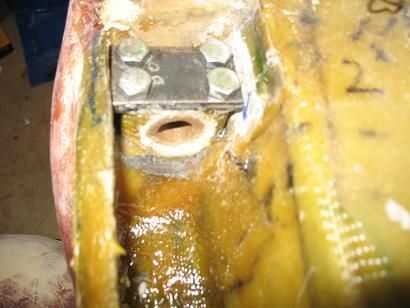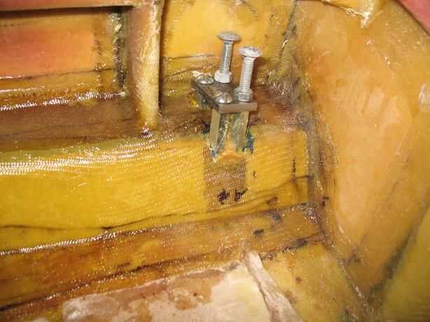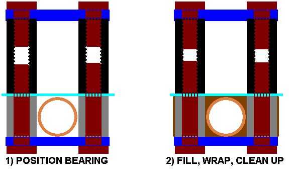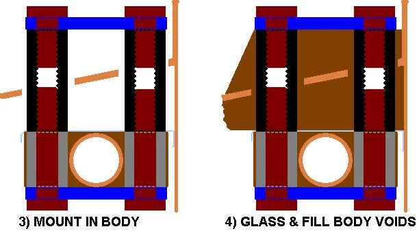 Los bloques se resbalaron en los extremos del eje cruzado del enganche, el enganche se puso en marcha con los bloques de rodamiento montados con tuercas conector a través de orificios en el cuerpo y los vacíos llenan de fibra de vidrio y acudieron relleno de epoxi. (No olvide utilizar cinta de mylar u otro agente de liberación entre el epoxy con bloques y epoxy aplicados al cuerpo). Después del ajuste, el eje de enganche fue quitado para permitir limpiar alrededor de los bloques, curva y añadir el ratón en el eje de enganche.