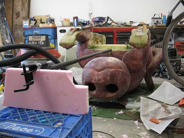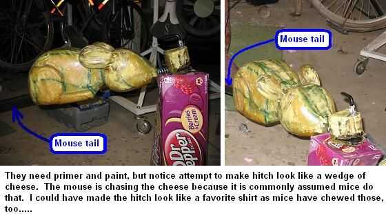 La capa del centro de la espuma en el ratón fue cortada a lo largo de la parte inferior, cuando reunió a los lados del ratón, que esto crea un túnel para el eje de enganche pasar a través. Dos tuercas incrustadas en el cuerpo permiten el ratón para ser atornillados al eje pero también hacerla extraíble. Orejas de ratón fueron hechas de espuma, cubierta con fibra de vidrio, la espuma excavada, las orejas fueron cortadas y pegadas a la cabeza y los hombros. Fibra de vidrio adicional a través de la parte delantera de las orejas les había atado a la cabeza.