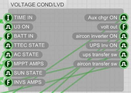 Vía software utilicé matemáticas básicas para la lectura de tensión hacia el valor real. También puedo decir cuántos minutos ha sido el regulador de carga en voltaje constante (como "completo" es el Banco de baterías") de modo. Todo acerca de los niveles de tensión en esta sección de mi otro esquemático.