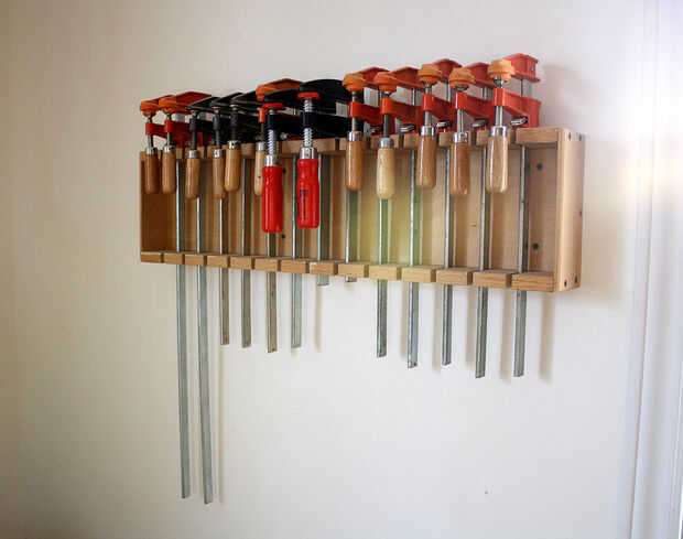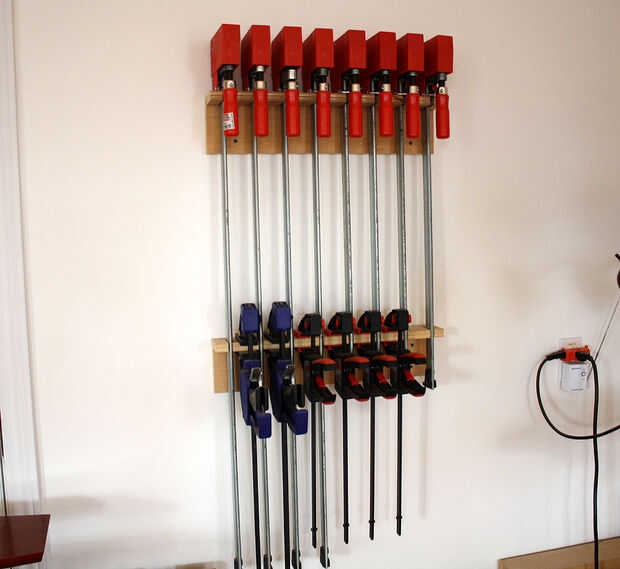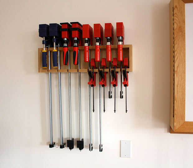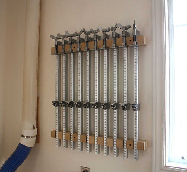 Hay pinzas más comunes que se utilizan bastante a menudo. Estas abrazaderas más comunes tienen un formato estándar y se prestan bien para un rack de pared abrazadera. El rack de pared abrazadera tiene un perfil bajo y alejados de la mayoría de las operaciones de carpintería en el taller.