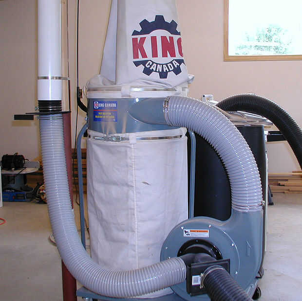 Es una puerta de plástico blast en consonancia con una manguera flexible, negro 4 pulg y conducto sólido de 4 pulg. La manguera flexible plástica está conectado a una cepilladora de capacidad de 15 pulg. Los ductos de 4 pulg de diámetro y tubos de sistemas de recolección de polvo de taller es en contraste con el tamaño del diámetro 1.5 pulgadas de aspiradoras de taller convencionales que están diseñados para tener alta succión. Colectores de polvo consisten en un motor, una lámina de rotor, una cubierta y un sistema de bolsa o cartucho. El tamaño del motor es el factor determinante en la capacidad del colector de polvo. Tamaños motor de colector de polvo por lo general van desde 1 HP a 2 HP para el taller de media. Aunque parezca económico inicialmente comprar un colector de 1 HP, usted encontrará que sus necesidades superan rápidamente la unidad. En nuestra opinión, el colector de polvo de 1.5 HP es el mejor compromiso inicialmente. El costo no es excesivo, todavía proporciona capacidad suficiente para el crecimiento imprevisto de tamaño de la tienda, un aumento en el número de máquinas en la tienda, y la distancia entre máquinas o tuberías correr largos.