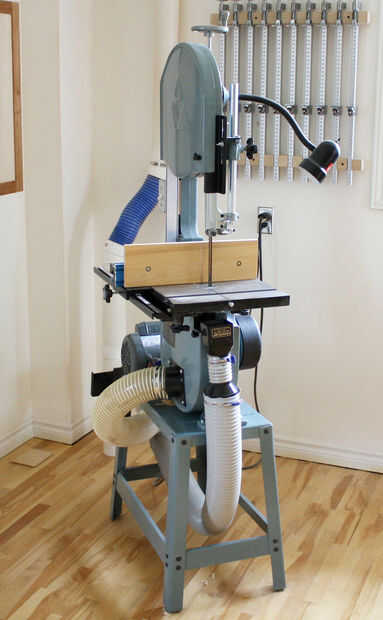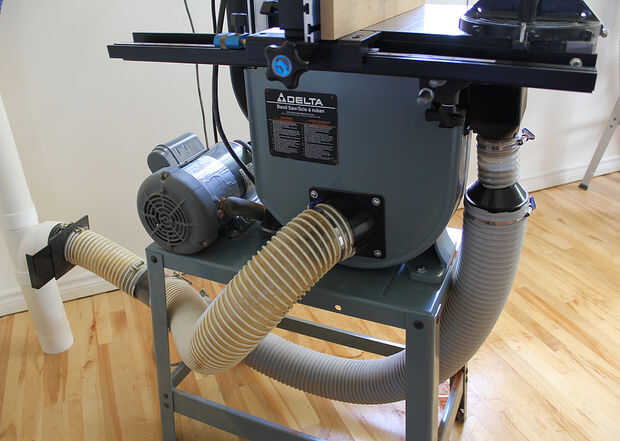 Sierras de cinta a menudo plantean un desafío para colección de polvo. Polvo fino se crea y sigue el movimiento de rueda de disco y Sierra de cinta. Puertos de polvo de fábrica ubicados debajo de la mesa de Sierra de cinta sólo tuvo éxito en capturar una parte del polvillo generado. La necesidad de otro puerto de polvo en el ápice de la rueda más baja se convierte en crítica para capturar todo el polvo fino antes de que salga la rueda inferior cubierta vivienda. En esta foto he diseñado y adaptado una brida de puerto de polvo a la cubierta inferior de una sierra de cinta estándar de 14 pulgadas. La eliminación de polvo se mejora este puerto adicional de polvo.
