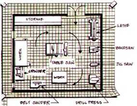 Las máquinas deben ser espaciadas un mínimo de 3 pies de distanciadas. Si el espacio es limitado, instalar bases balanceo del equipo. Máquinas deben colocarse a no impedir el flujo de tráfico. Material, materia prima madera y acabado mercancías, necesita ser movido dentro y fuera de la tienda. Proporcionan una gran puerta o una ventana para ello. Máquinas utilizadas en una secuencia deben colocarse muy juntos. Deje un amplio espacio para puertas. Herramientas se pueden colocar en tableros montados en paredes o en gabinetes de herramienta independiente separado.