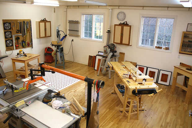 Debe elaborarse un plano general para su taller. Todo el equipo debe colocarse para ofrecer la máxima flexibilidad y con la capacidad para maniobrar alrededor de las máquinas y su banco de trabajo o mesas de trabajo. Si usted tiene un gran espacio disponible, plan para el futuro equipo adicional. Un área de almacenamiento de madera es importante, y puede ser bien situada en el taller o fuera. Foto muestra una vista reciente de mi actual taller de carpintería.