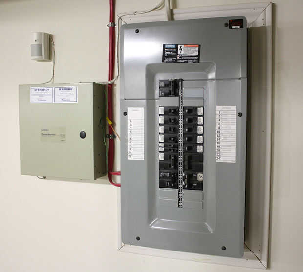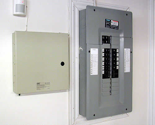 Muestra es un sub panel eléctrico para el taller. Este panel secundario particular o pony se encuentra junto a una caja de control del sistema de alarma con sensor de movimiento conectado.