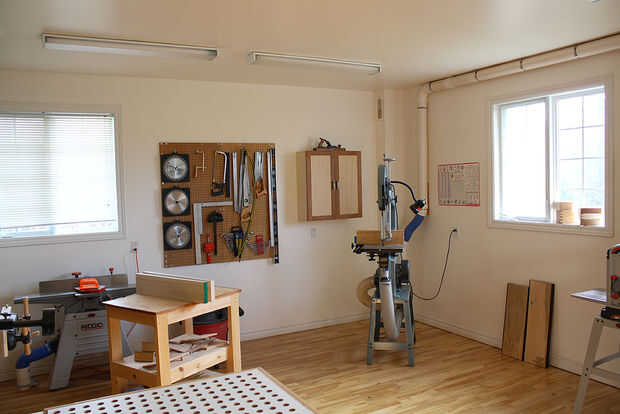 Las fotos muestran cómo los bancos de luces fluorescentes se utilizan en un taller de carpintería típico, mi taller actual. Los bancos pueden ser encendidos y apagado por separado y la concentración de la luz crea un ambiente brillante. La incidencia de lesiones se reduce si el trabajo es tiene grandes cantidades de luz. También son menos propensos a cometer errores ya que las piezas de trabajo son fáciles de ver. Al terminar un proyecto, un ambiente luminoso y bien iluminado muestra cualquier defectos de la superficie mejor. En mi diseño de taller, se incrementó la cantidad de ventanas para traer más luz ambiente. En días soleados, casi nunca enciendo alguno de los bancos fluorescentes de la luz. Iluminación es importante al hacer el trabajo de la mano tales como corte y colocación de carpintería de la cola de Milano. Tengo una lámpara portátil conectada a cada uno de mis cuatro mesas de trabajo.
