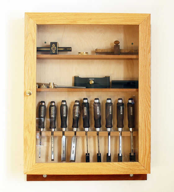Segunda foto muestra una típica pared gabinete de cinceles y herramientas de la marca, la puerta tiene un panel irrompible lexan (policarbonato). El gabinete está hecho de roble, la puerta es una construcción de marco y el panel a inglete reforzada con galletas.