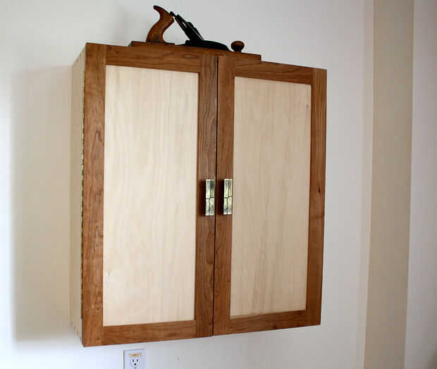 Siguiente o cuarta foto muestra otra versión del gabinete montado en la pared mostrada anteriormente, pero para los pedacitos de taladro, brocas y herramientas de diseño. La construcción es muy similar a los gabinetes de pared anterior. La puerta de entrada es necesaria para mantener el polvo fuera del gabinete. Este gabinete está hecha de pedazos de pino extra ahí el taller.