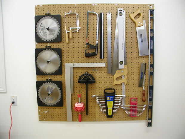 Un pegboard montado en la pared se muestra pasado. El perforado es para abrazaderas, herramientas, accesorios, niveles y herramientas de medición. Acceso rápido es una característica importante de la pegboard montado en la pared.
